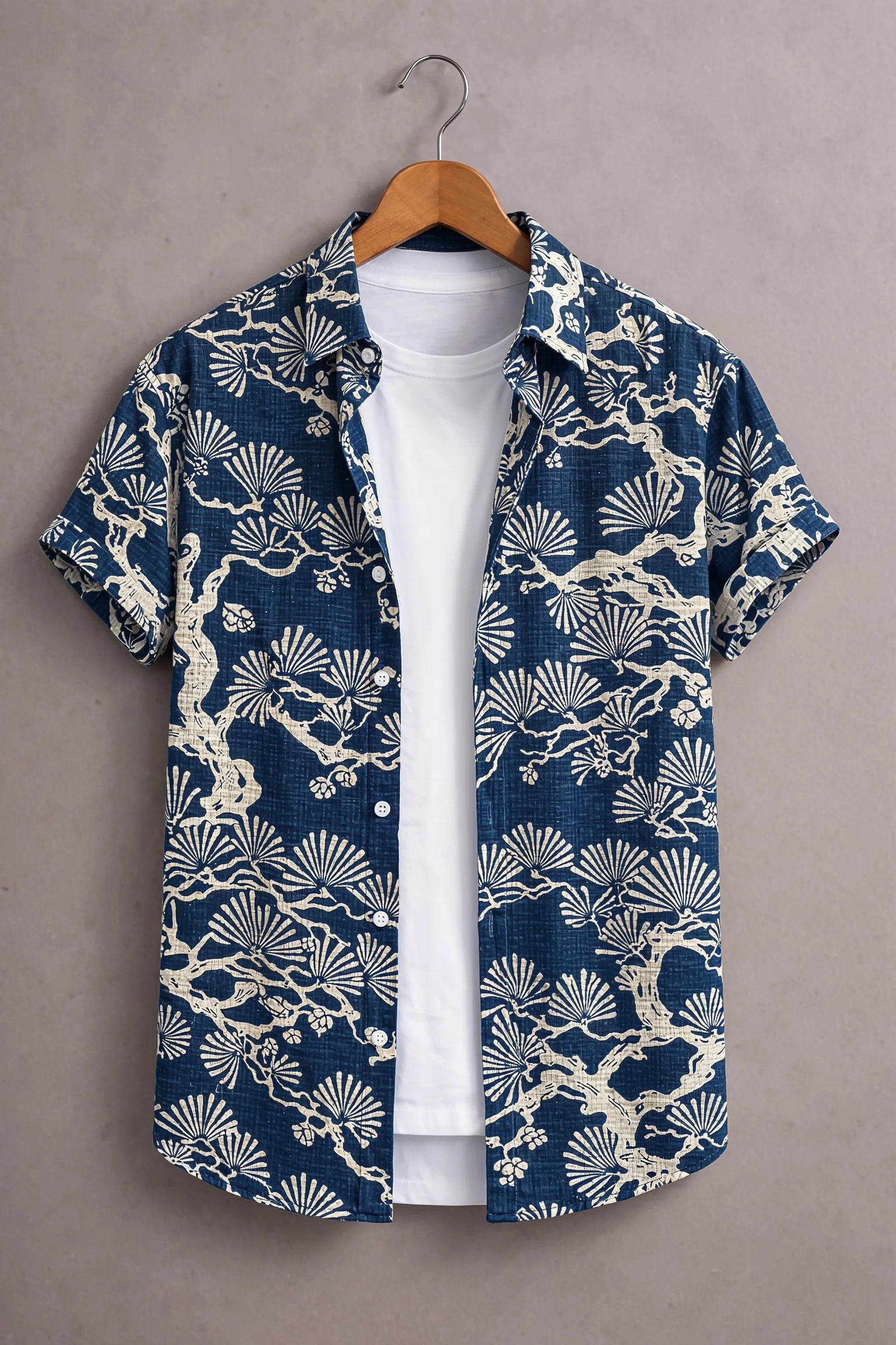 Add a touch of artistic elegance to your wardrobe with this Men’s Navy Blue Japanese Tree Printed Shirt. Designed for men who appreciate unique patterns and modern fashion, this shirt features a rich navy blue base enhanced with intricate white tree branch and fan-style prints, inspired by classic Japanese art aesthetics.
