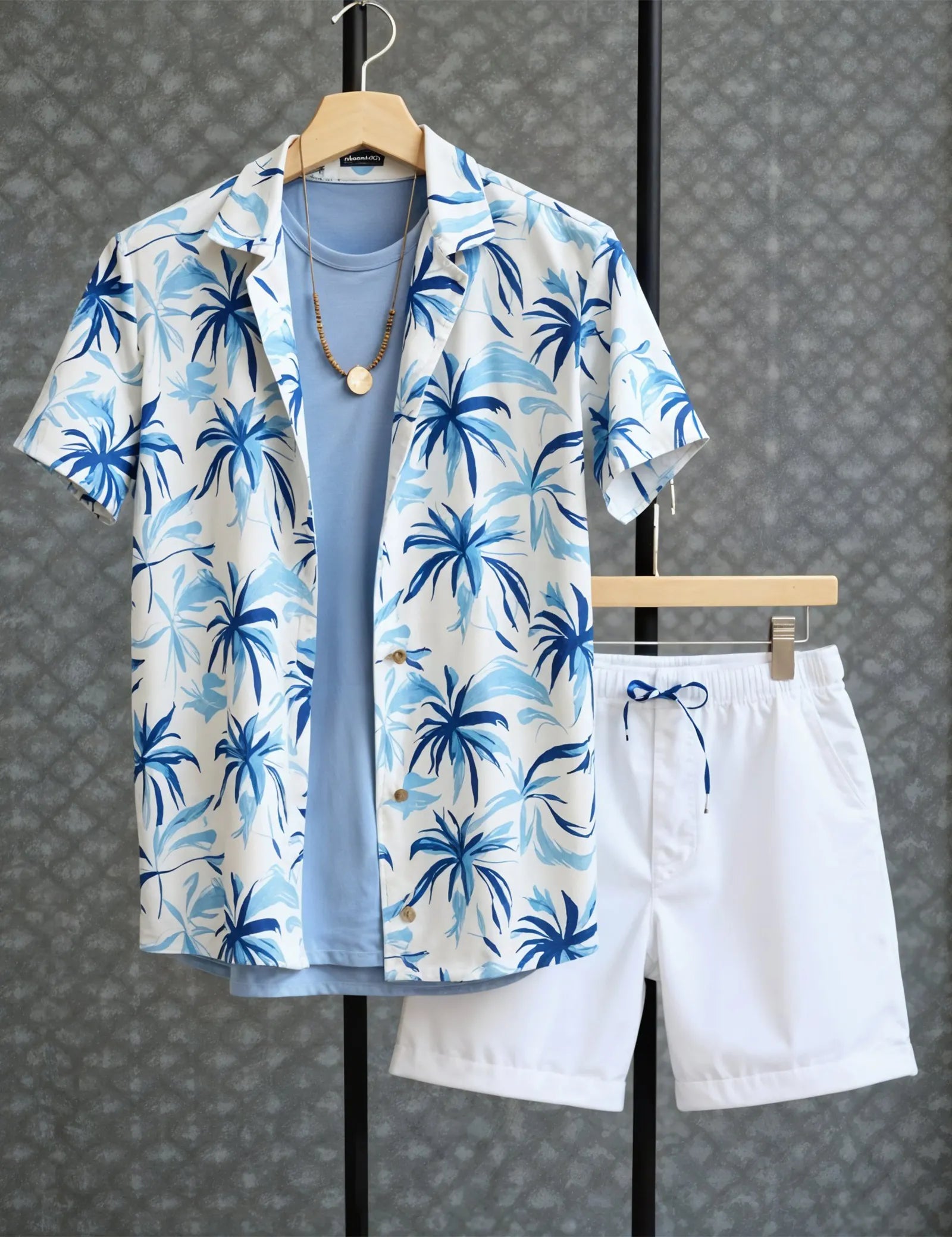Men's Blue & White Palm Print Shirt and Shorts Set – Coastal Style Summer Outfit